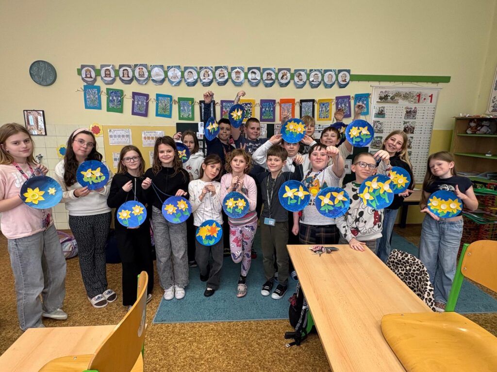 Děti ve 4. C nezapomněly na Mezinárodní den žen a vyrobily maminkám kytičku narcisek na závěsném obrázku.