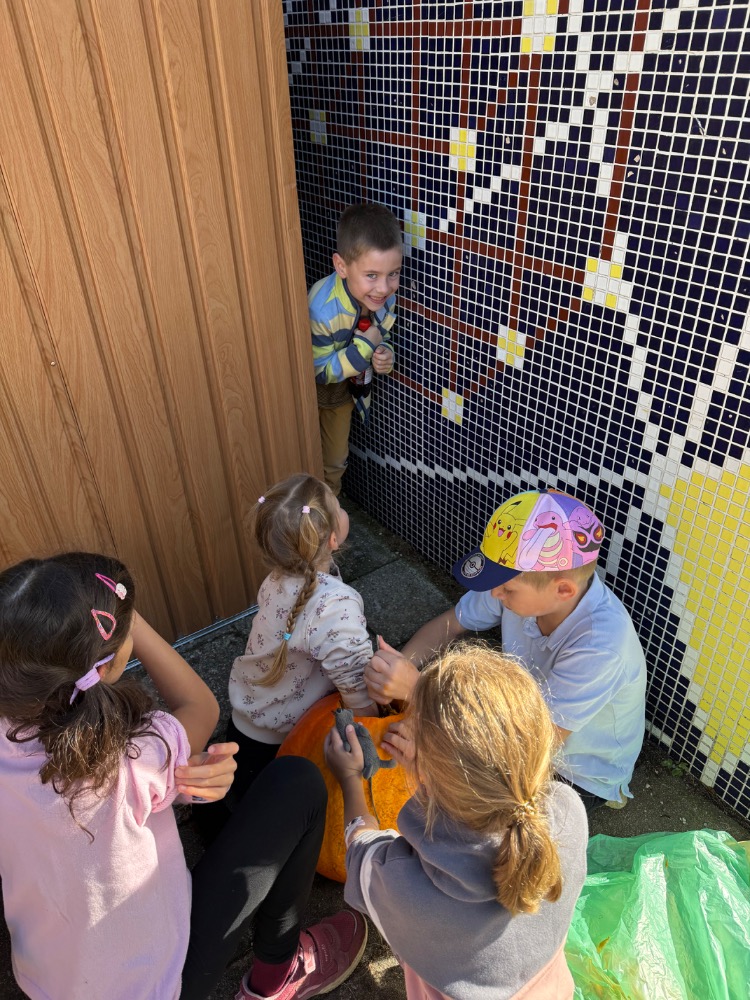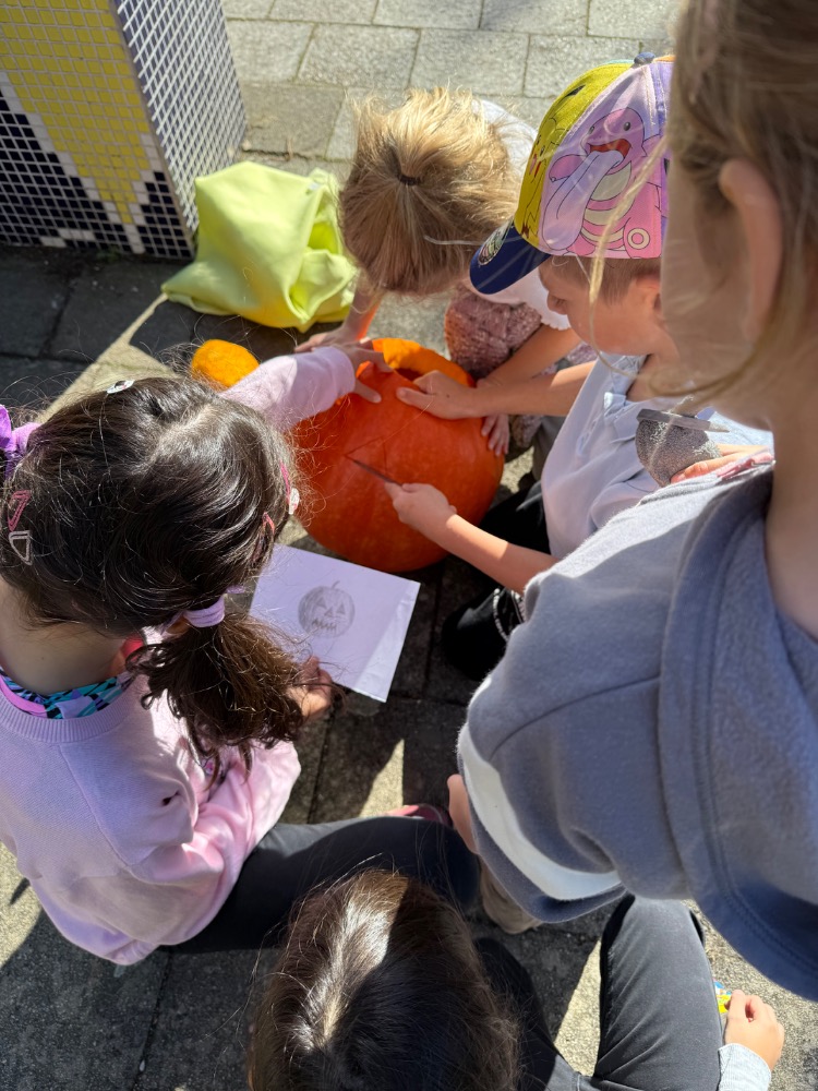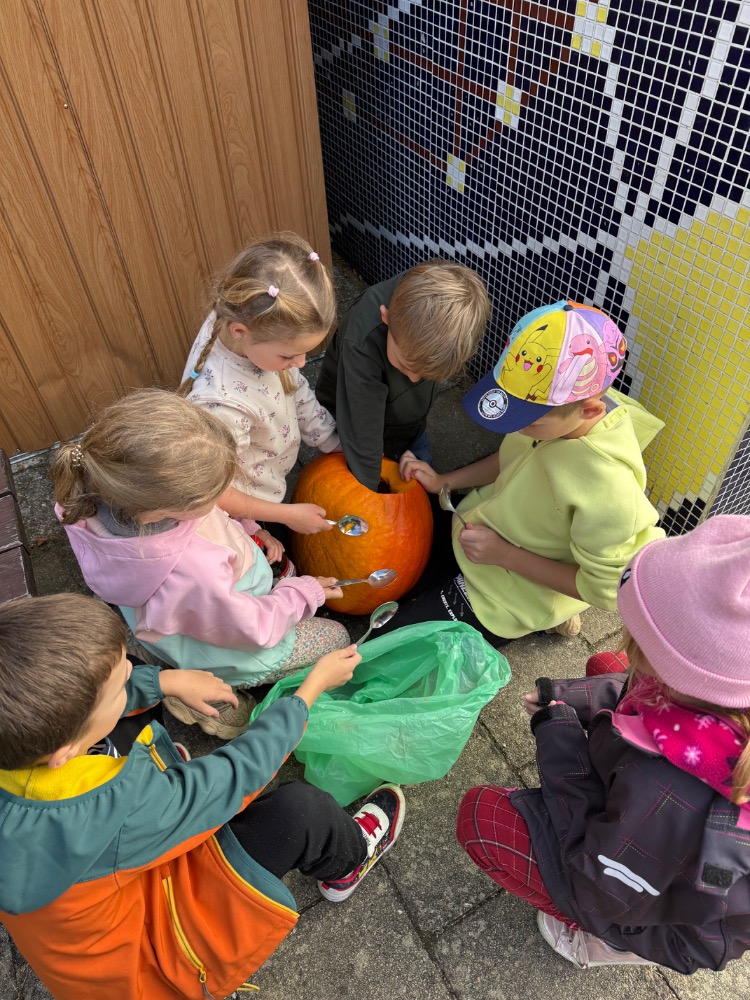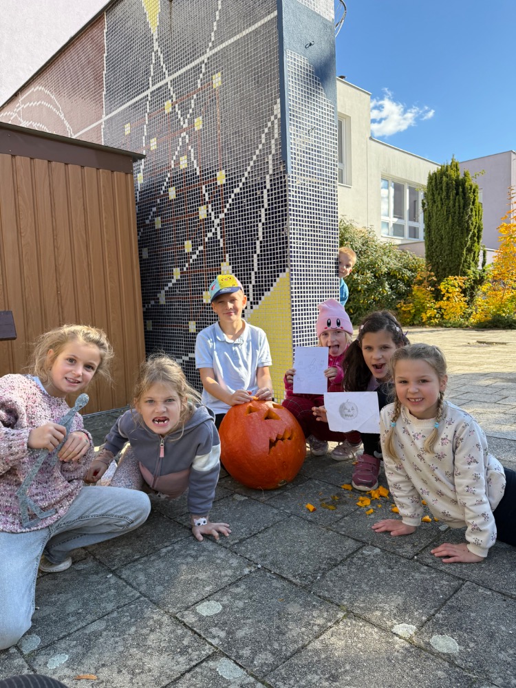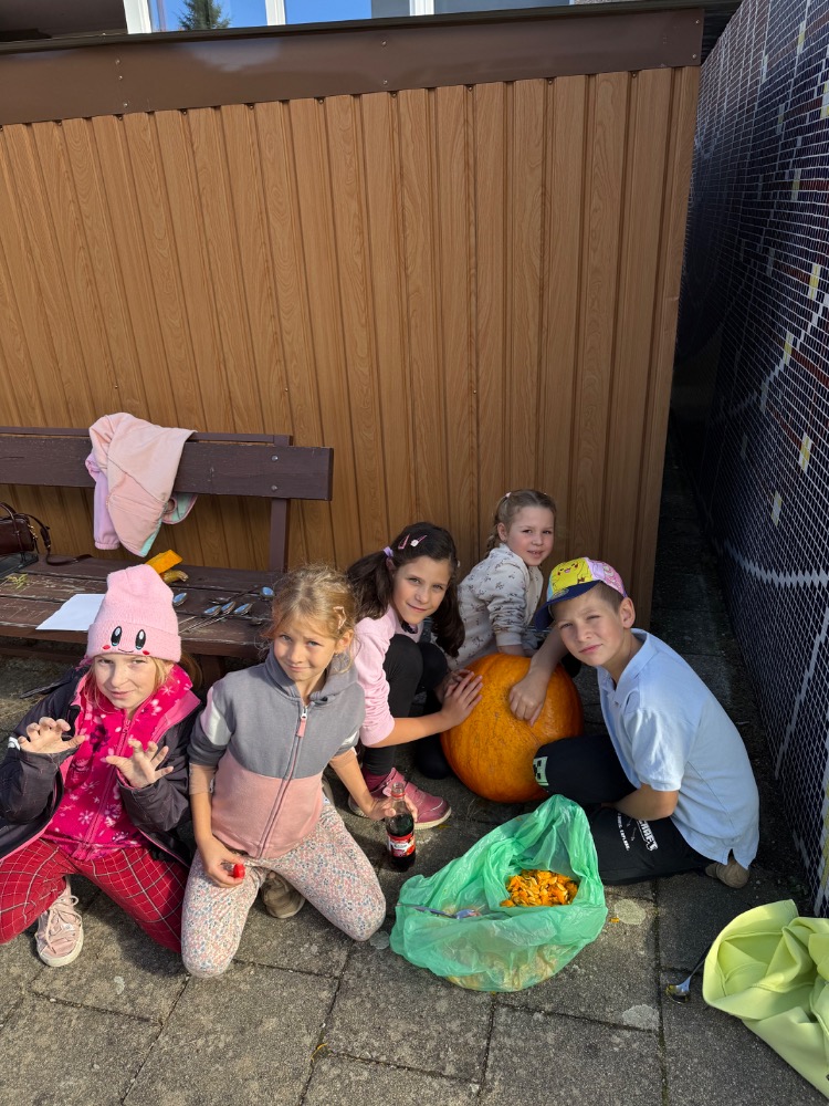 Naše družina voněla podzimem! Děti se s chutí pustily do dlabání dýně – společně vymýšlely, jaký obličej bude mít, a každý, kdo chtěl, přidal svůj nápad i ruku k dílu. Práce jim šla od ruky, nechyběl smích ani trochu nepořádku, a nakonec vznikla krásná dýňová ozdoba, která nám teď dělá radost před školou.